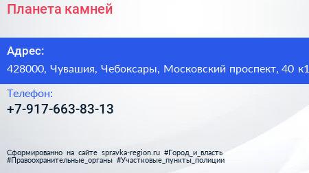 Планета камней по адресу 428000, Чувашия, Чебоксары, Московский проспект, 40 к1 в дальнейшем Организация, размещена в следующих категориях: