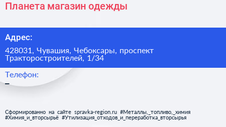 Планета, магазин одежды по адресу 428031, Чувашия, Чебоксары, проспект Тракторостроителей, 1/34 в дальнейшем Организация, размещена в следующих категориях: