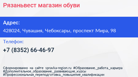Рязаньвест, магазин обуви по адресу 428024, Чувашия, Чебоксары, проспект Мира, 98 в дальнейшем Организация, размещена в следующих категориях: