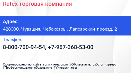 Rutex, торговая компания по адресу 428000, Чувашия, Чебоксары, Лапсарский проезд, 2 в дальнейшем Организация, размещена в следующих категориях: