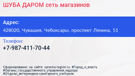 ШУБА ДАРОМ, сеть магазинов по адресу 428020, Чувашия, Чебоксары, проспект Ленина, 51 в дальнейшем Организация, размещена в следующих категориях: