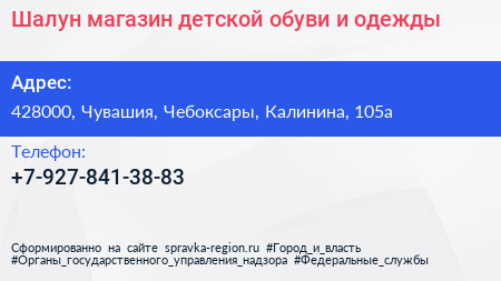 Шалун, магазин детской обуви и одежды по адресу 428000, Чувашия, Чебоксары, Калинина, 105а в дальнейшем Организация, размещена в следующих категориях: