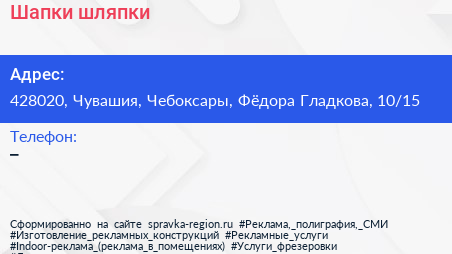 Шапки-шляпки по адресу 428020, Чувашия, Чебоксары, Фёдора Гладкова, 10/15 в дальнейшем Организация, размещена в следующих категориях: