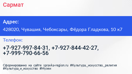 Сармат по адресу 428020, Чувашия, Чебоксары, Фёдора Гладкова, 10 к7 в дальнейшем Организация, размещена в следующих категориях:
