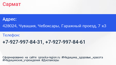 Сармат по адресу 428024, Чувашия, Чебоксары, Гаражный проезд, 7 к3 в дальнейшем Организация, размещена в следующих категориях: