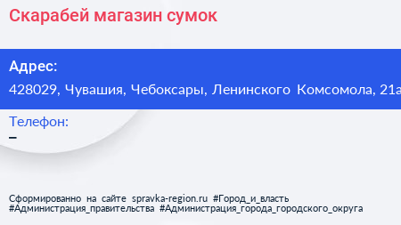 Скарабей, магазин сумок по адресу 428029, Чувашия, Чебоксары, Ленинского Комсомола, 21а в дальнейшем Организация, размещена в следующих категориях: