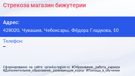 Стрекоза, магазин бижутерии по адресу 428020, Чувашия, Чебоксары, Фёдора Гладкова, 10 в дальнейшем Организация, размещена в следующих категориях: