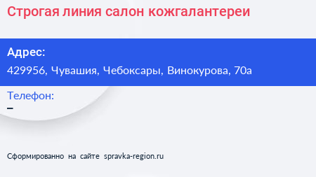 Строгая линия, салон кожгалантереи по адресу 429956, Чувашия, Чебоксары, Винокурова, 70а в дальнейшем Организация, размещена в следующих категориях: