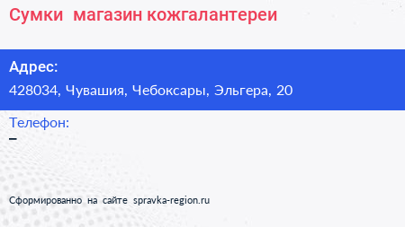 Сумки+, магазин кожгалантереи по адресу 428034, Чувашия, Чебоксары, Эльгера, 20 в дальнейшем Организация, размещена в следующих категориях: