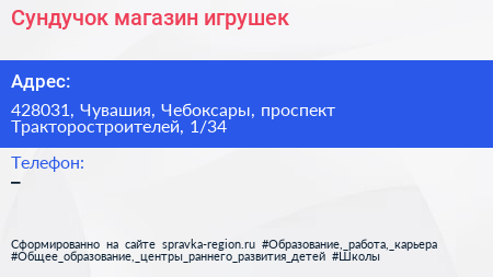 Сундучок, магазин игрушек по адресу 428031, Чувашия, Чебоксары, проспект Тракторостроителей, 1/34 в дальнейшем Организация, размещена в следующих категориях: