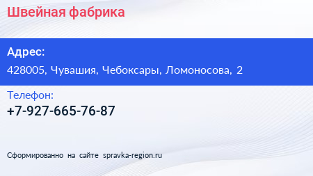 Швейная фабрика по адресу 428005, Чувашия, Чебоксары, Ломоносова, 2 в дальнейшем Организация, размещена в следующих категориях: