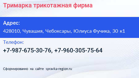 Тримарка, трикотажная фирма по адресу 428010, Чувашия, Чебоксары, Юлиуса Фучика, 30 к1 в дальнейшем Организация, размещена в следующих категориях: