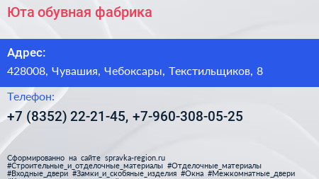Юта, обувная фабрика по адресу 428008, Чувашия, Чебоксары, Текстильщиков, 8 в дальнейшем Организация, размещена в следующих категориях: