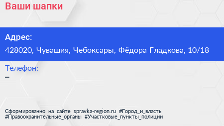 Ваши шапки по адресу 428020, Чувашия, Чебоксары, Фёдора Гладкова, 10/18 в дальнейшем Организация, размещена в следующих категориях: