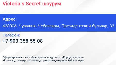 Victoria’s Secret, шоурум по адресу 428006, Чувашия, Чебоксары, Президентский бульвар, 33 в дальнейшем Организация, размещена в следующих категориях: