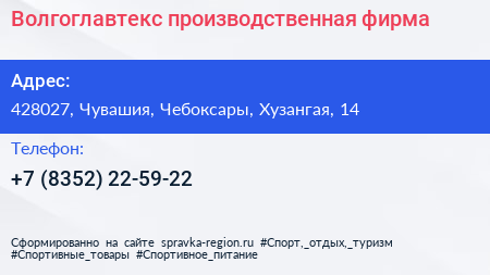 Волгоглавтекс, производственная фирма по адресу 428027, Чувашия, Чебоксары, Хузангая, 14 в дальнейшем Организация, размещена в следующих категориях: