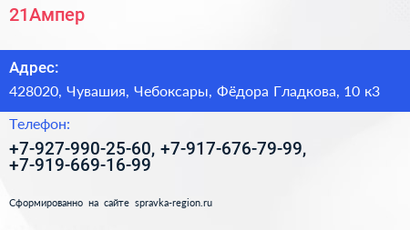 21Ампер по адресу 428020, Чувашия, Чебоксары, Фёдора Гладкова, 10 к3 в дальнейшем Организация, размещена в следующих категориях:
