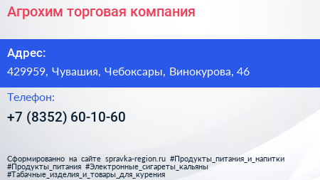 Агрохим, торговая компания по адресу 429959, Чувашия, Чебоксары, Винокурова, 46 в дальнейшем Организация, размещена в следующих категориях:
