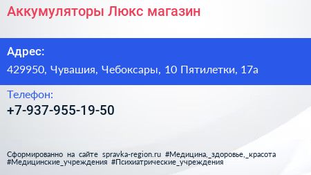 Аккумуляторы-Люкс, магазин по адресу 429950, Чувашия, Чебоксары, 10 Пятилетки, 17а в дальнейшем Организация, размещена в следующих категориях: