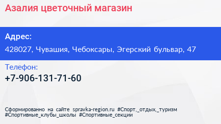 Азалия, цветочный магазин по адресу 428027, Чувашия, Чебоксары, Эгерский бульвар, 47 в дальнейшем Организация, размещена в следующих категориях:
