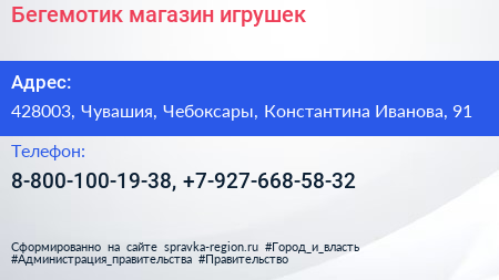 Бегемотик, магазин игрушек по адресу 428003, Чувашия, Чебоксары, Константина Иванова, 91 в дальнейшем Организация, размещена в следующих категориях: