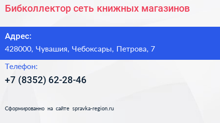 Бибколлектор, сеть книжных магазинов по адресу 428000, Чувашия, Чебоксары, Петрова, 7 в дальнейшем Организация, размещена в следующих категориях: