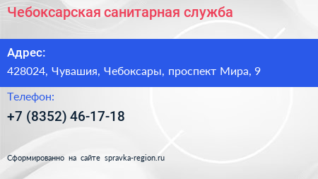 Чебоксарская санитарная служба по адресу 428024, Чувашия, Чебоксары, проспект Мира, 9 в дальнейшем Организация, размещена в следующих категориях: