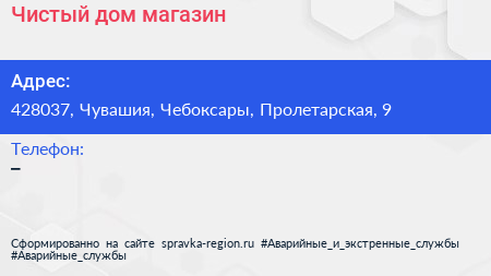 Чистый дом, магазин по адресу 428037, Чувашия, Чебоксары, Пролетарская, 9 в дальнейшем Организация, размещена в следующих категориях: