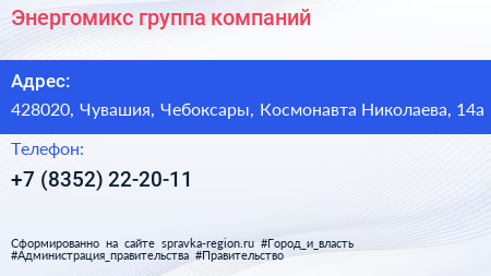 Энергомикс, группа компаний по адресу 428020, Чувашия, Чебоксары, Космонавта Николаева, 14а в дальнейшем Организация, размещена в следующих категориях: