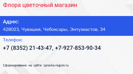 Флора, цветочный магазин по адресу 428023, Чувашия, Чебоксары, Энтузиастов, 34 в дальнейшем Организация, размещена в следующих категориях: