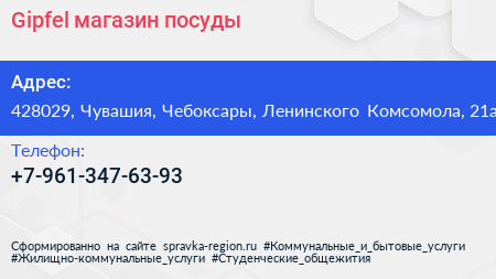 Gipfel, магазин посуды по адресу 428029, Чувашия, Чебоксары, Ленинского Комсомола, 21а в дальнейшем Организация, размещена в следующих категориях: