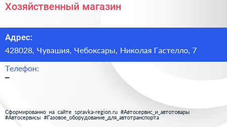 Хозяйственный магазин по адресу 428028, Чувашия, Чебоксары, Николая Гастелло, 7 в дальнейшем Организация, размещена в следующих категориях: