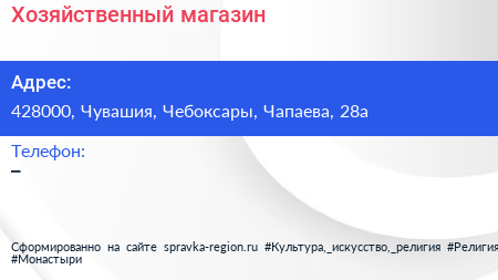 Хозяйственный магазин по адресу 428000, Чувашия, Чебоксары, Чапаева, 28а в дальнейшем Организация, размещена в следующих категориях: