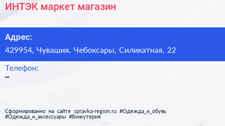 ИНТЭК-маркет, магазин по адресу 429954, Чувашия, Чебоксары, Силикатная, 22 в дальнейшем Организация, размещена в следующих категориях: