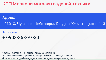 КЭП Маркони, магазин садовой техники по адресу 428010, Чувашия, Чебоксары, Богдана Хмельницкого, 113 в дальнейшем Организация, размещена в следующих категориях: