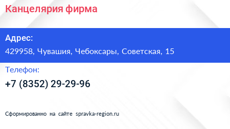 Для связи с организацией воспользуйтесь номером телефона: +7 (8352) 29-29-96. Пн: c 09:00-20:00, Вт: c 09:00-20:00, Ср: c 09:00-20:00, Чт: c 09:00-20:00, Пт: c 09:00-20:00, Сб: c 09:00-20:00, Вс: c 09:00-19:00, вы можете обратиться в эту организацию.