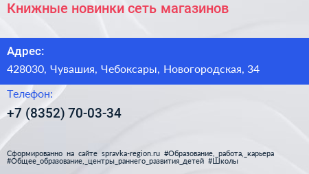 Книжные новинки, сеть магазинов по адресу 428030, Чувашия, Чебоксары, Новогородская, 34 в дальнейшем Организация, размещена в следующих категориях: