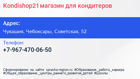 Kondishop21, магазин для кондитеров по адресу Чувашия, Чебоксары, Советская, 52 в дальнейшем Организация, размещена в следующих категориях: