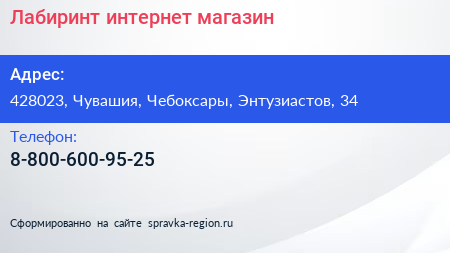 Лабиринт, интернет-магазин по адресу 428023, Чувашия, Чебоксары, Энтузиастов, 34 в дальнейшем Организация, размещена в следующих категориях:
