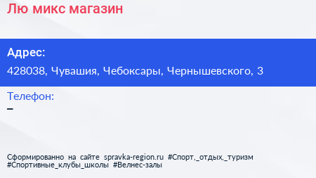 Лю-микс, магазин по адресу 428038, Чувашия, Чебоксары, Чернышевского, 3 в дальнейшем Организация, размещена в следующих категориях: