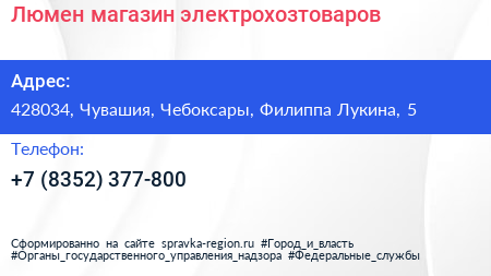 Люмен, магазин электрохозтоваров по адресу 428034, Чувашия, Чебоксары, Филиппа Лукина, 5 в дальнейшем Организация, размещена в следующих категориях: