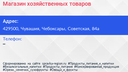 Магазин хозяйственных товаров по адресу 429500, Чувашия, Чебоксары, Советская, 84а в дальнейшем Организация, размещена в следующих категориях: