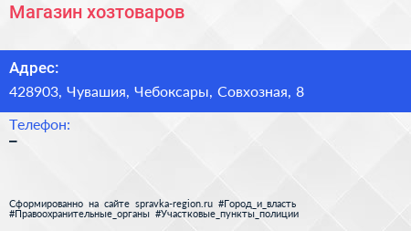 Магазин хозтоваров по адресу 428903, Чувашия, Чебоксары, Совхозная, 8 в дальнейшем Организация, размещена в следующих категориях:
