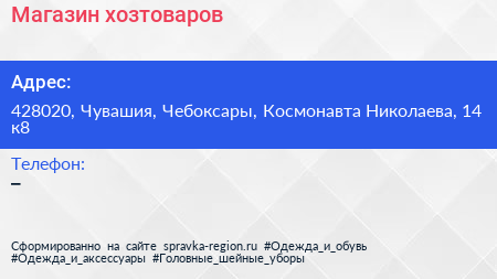 Магазин хозтоваров по адресу 428020, Чувашия, Чебоксары, Космонавта Николаева, 14 к8 в дальнейшем Организация, размещена в следующих категориях: