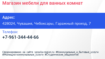 Магазин мебели для ванных комнат по адресу 428024, Чувашия, Чебоксары, Гаражный проезд, 7 в дальнейшем Организация, размещена в следующих категориях: