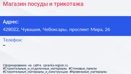 Магазин посуды и трикотажа по адресу 428022, Чувашия, Чебоксары, проспект Мира, 26 в дальнейшем Организация, размещена в следующих категориях: