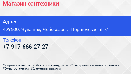 Магазин сантехники по адресу 429500, Чувашия, Чебоксары, Шоршелская, 6 к1 в дальнейшем Организация, размещена в следующих категориях: