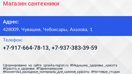Магазин сантехники по адресу 428009, Чувашия, Чебоксары, Ахазова, 1 в дальнейшем Организация, размещена в следующих категориях: