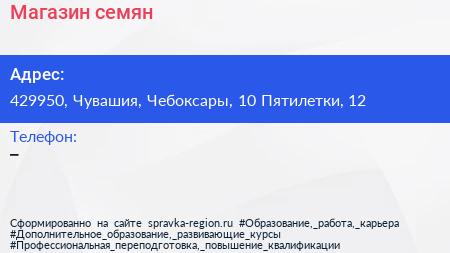 Магазин семян по адресу 429950, Чувашия, Чебоксары, 10 Пятилетки, 12 в дальнейшем Организация, размещена в следующих категориях: