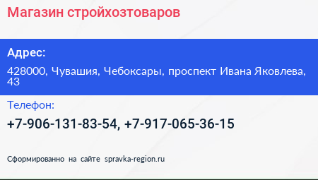 Магазин стройхозтоваров по адресу 428000, Чувашия, Чебоксары, проспект Ивана Яковлева, 43 в дальнейшем Организация, размещена в следующих категориях: